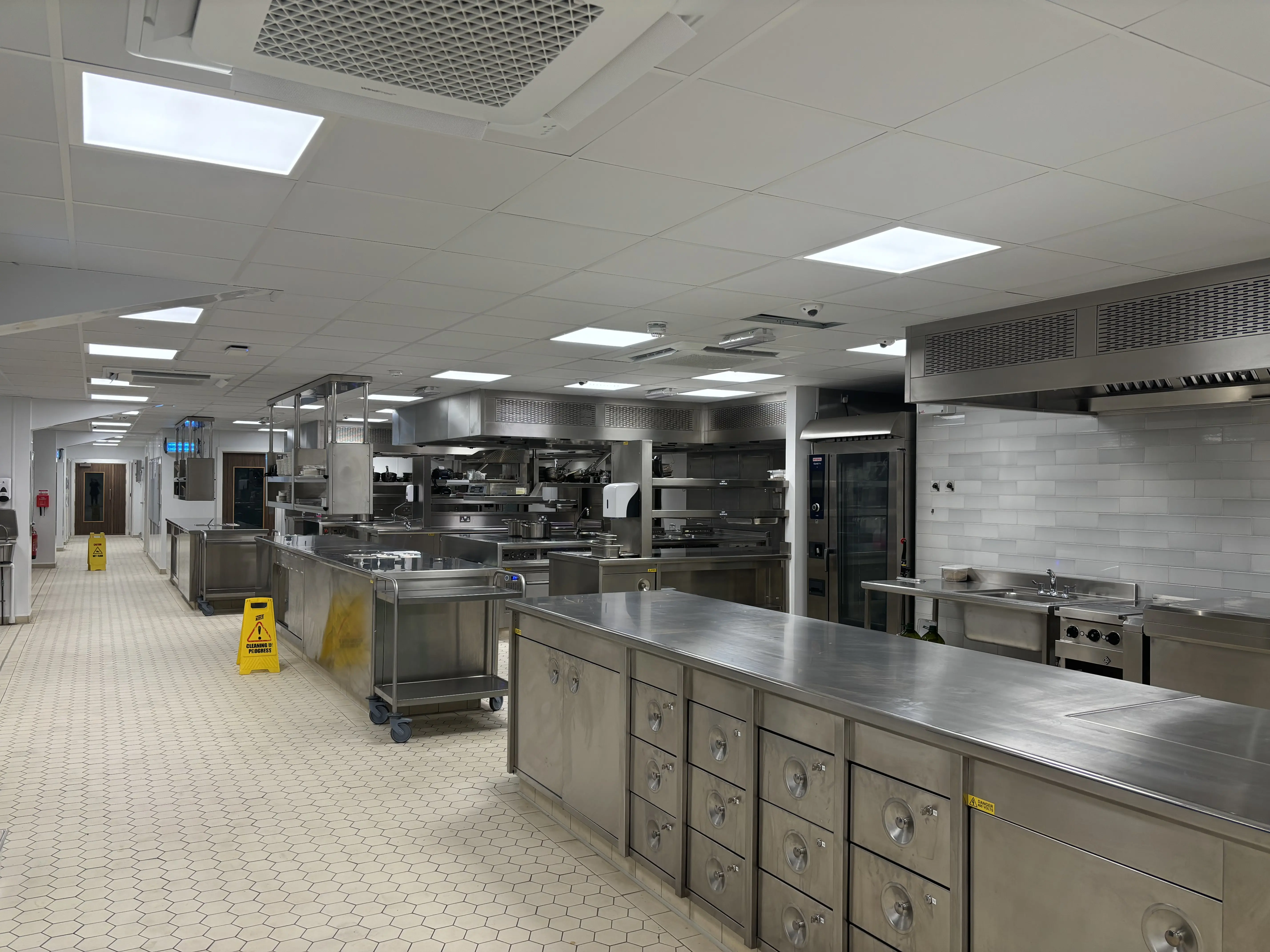 The project covered high-traffic public areas, as well as essential back-of-house spaces including commercial kitchens, offices, and staff welfare zones.